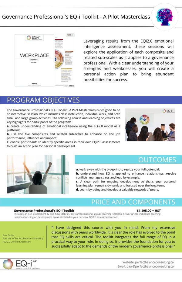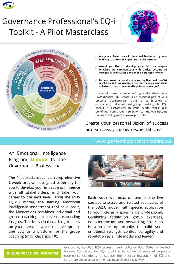 The Governance Professional’s EQ Toolkit is a six-week masterclass with a lively, interactive forum to develop your emotional quotient, with practical application to your role as a governance professional. Using a combination of individual and group coaching, this masterclass will provide insight, inspiration and a level of personal development that may astound you.